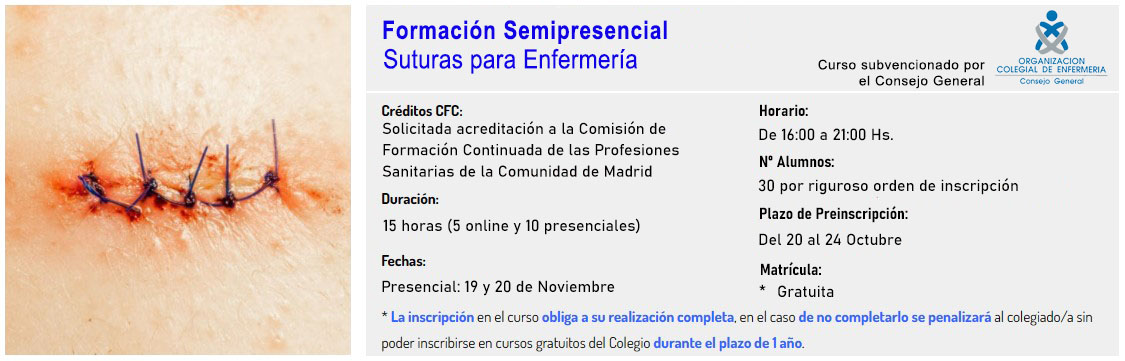 "Solicito mi inscripción en el Curso ISFOS "Suturas para Enfermería". Quedo enterada/o de que la inscripción en el Curso me obliga a su realización completa y de que en el caso de no completarlo seré penalizada/o sin poder inscribirme en cursos gratuitos del Colegio durante el plazo de un año."
